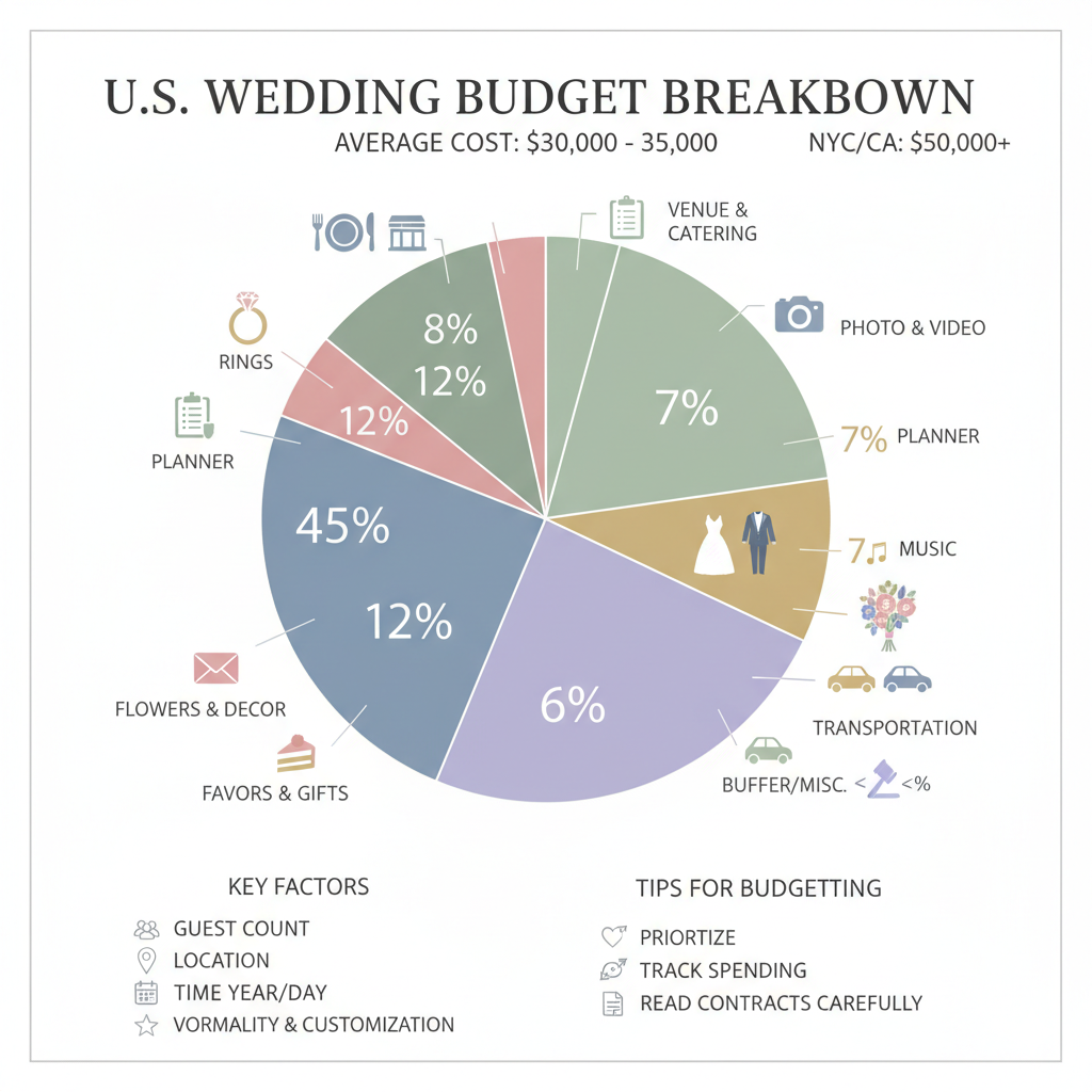 Instead, divide your budget into named areas — venue, food and beverage, photography, attire, design or flowers, music, planning support, a small miscellaneous line, and a buffer.